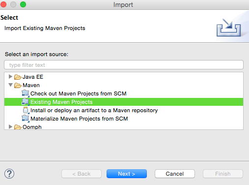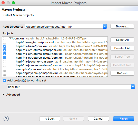 Next, browse to the directory where you checked out the HAPI FHIR sources. You might want to select only the projects you are interested in editing, in order to keep Eclipse's memory use down. You can always come back and import more later.